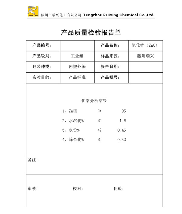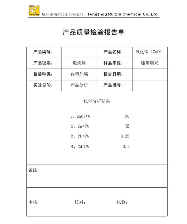 瑞興化工有限公司是生產(chǎn)氧化鋅的重點企業(yè),于2008年通過ISO9001:2008質(zhì)量管理體系認(rèn)證。“瑞興”牌氧化鋅在國內(nèi)擁有較大穩(wěn)定的市場,并遠(yuǎn)銷東南亞、中東、中南美等國家和地區(qū),在國內(nèi)外享有較高聲譽(yù)。